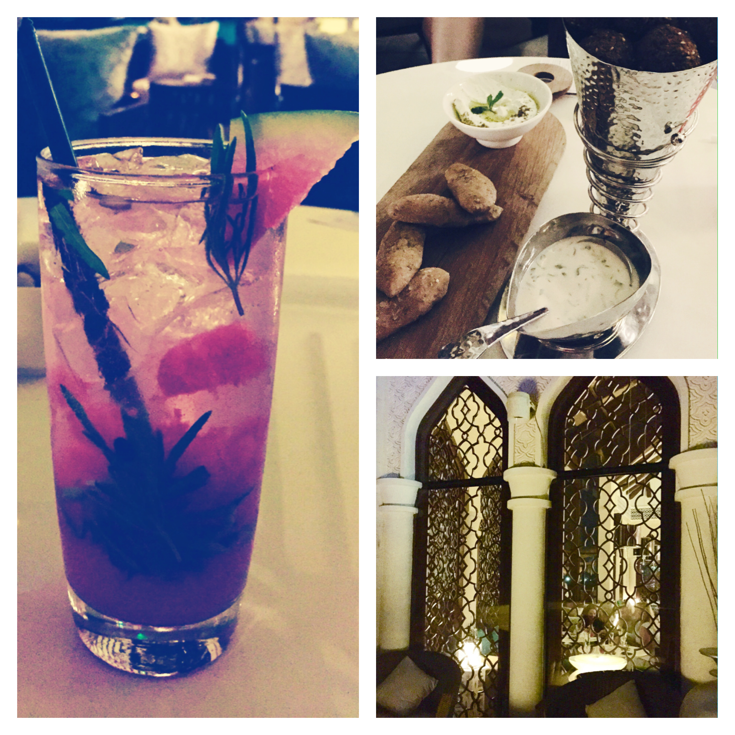 Once I had located the venue, which I had no idea was a standalone two-storey establishment off to one side of the hotel with its own entrance, my first experience of Byblos Sur Mer, which translated to English is ‘Byblos by the Seaside’ was an invitation to its ‘Ladies First’ night. This Ladies evening takes place in the upper floor lounge bar area and terrace every Tuesday evening from 8pm. The large Arabic style windows and terrace affords a stunning panorama out across the waterfront, beach, the hotel’s private marina and the skyline beyond. Plush furniture sits alongside traditional Phoenician citadel influenced architecture and accessories in this venue that is reminiscent of a Lebanese mountain house. Hosted by the lovely Reema, the ladies night was a relaxed and laid back evening with an eclectic mix of ladies of all ages and from all walks of life. Delectable signature cocktails made by the in-house mixologist were served accompanied by Arabic style bar snacks and live music floated up from the restaurant’s stage down below.