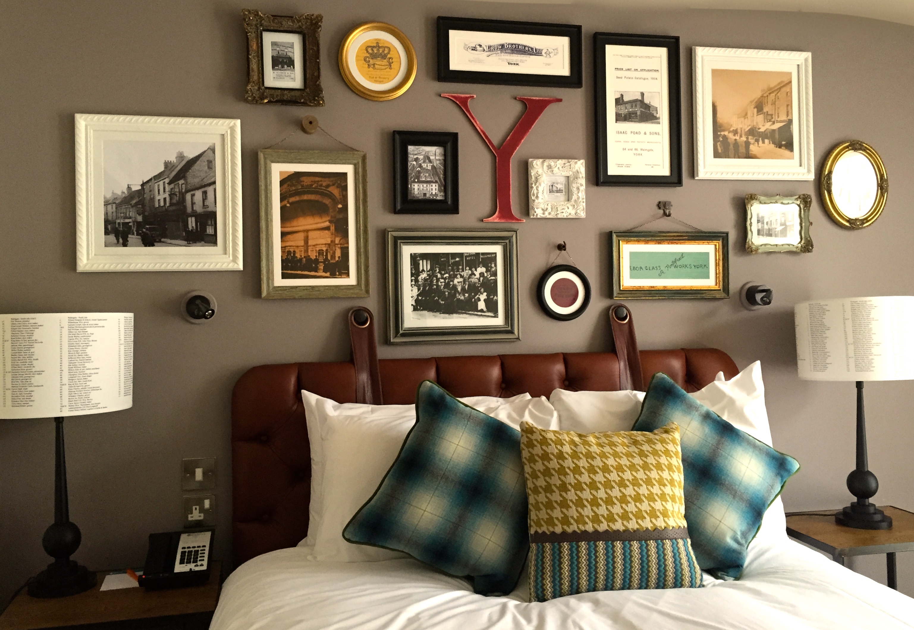 Our second floor room was large and well-appointed, filled with many design features, beautifully decorated throughout with the continuation of the local character concept. Attention to detail is everywhere at this hotel and the design team have been spot on with their vision and interior choices. The large, high bed was firm and extremely comfortable and the neutral tones of the walls, wooden floors and bed linen were offset by rich earthy tones of brown, orange, yellow and blue checked accessories and furnishings. I loved the quirky wall filled with themed art and vintage local photographs presented in varying sized mismatching coloured frames punctuated by a capital Y for York. A circular mirror hung by a leather belt over the desk, lamp shades that were filled with local characters from the neighbourhood, the extremely in vogue crocheted effect woollen footstool and the cool three shaded standard lamp which obviously just matched perfectly.