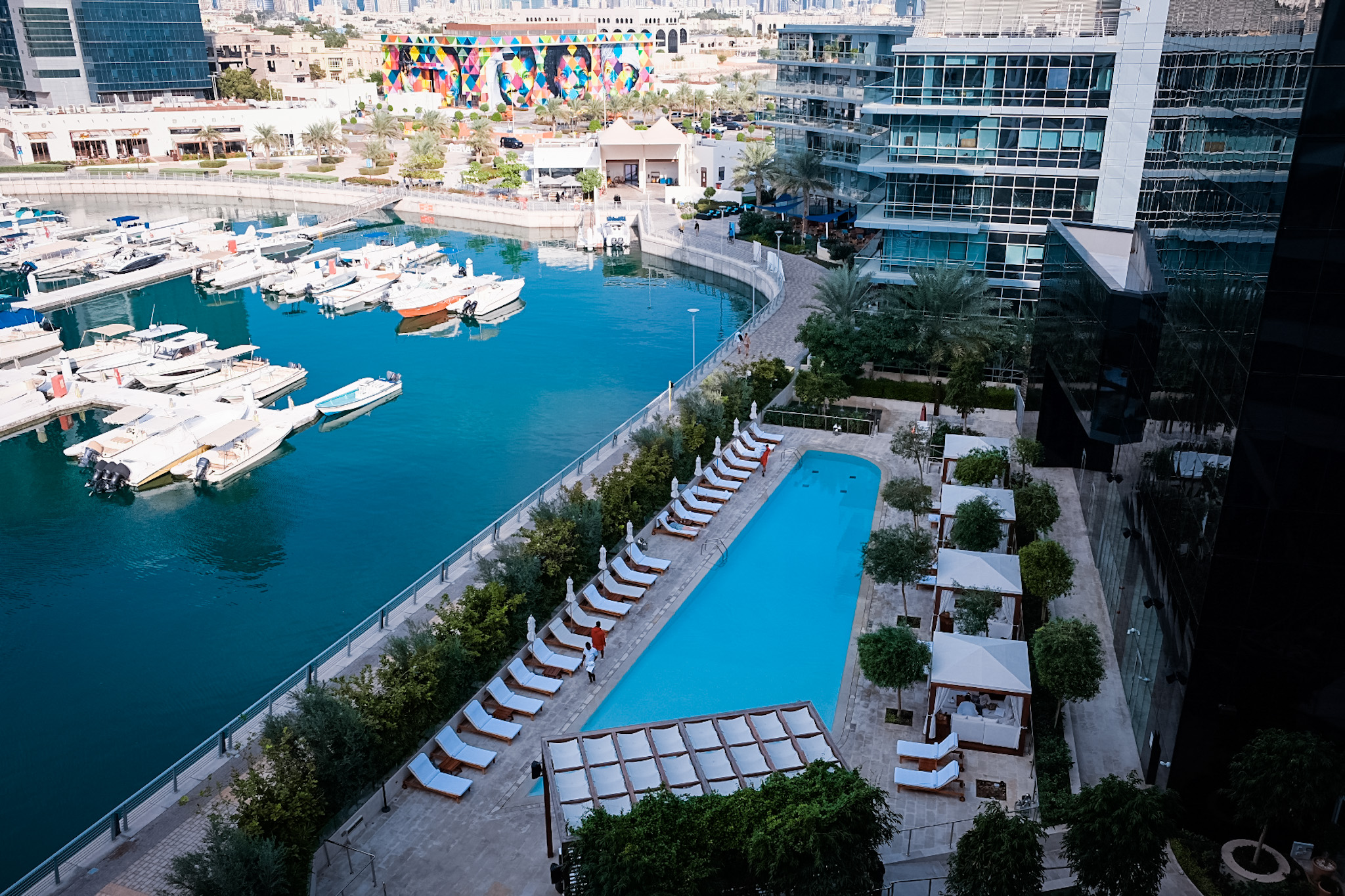 There are 198 guest rooms and suites spread over five floors as well as 57 serviced apartments. We stayed in a spacious marina view superior suite, a sanctuary of calm and modern design with a neutral, desert coloured interior offset by grey oak timber floors with a separate living room, dining area, bedroom, two balconies and bathroom. The extremely comfortable king size bed draped with soft throws guarantees a good night’s sleep. The large glass fronted white marble bathroom with a modern freestanding bath, double sinks, walk-in shower, separate toilet and bespoke Le Labo toiletries is a haven of luxury.