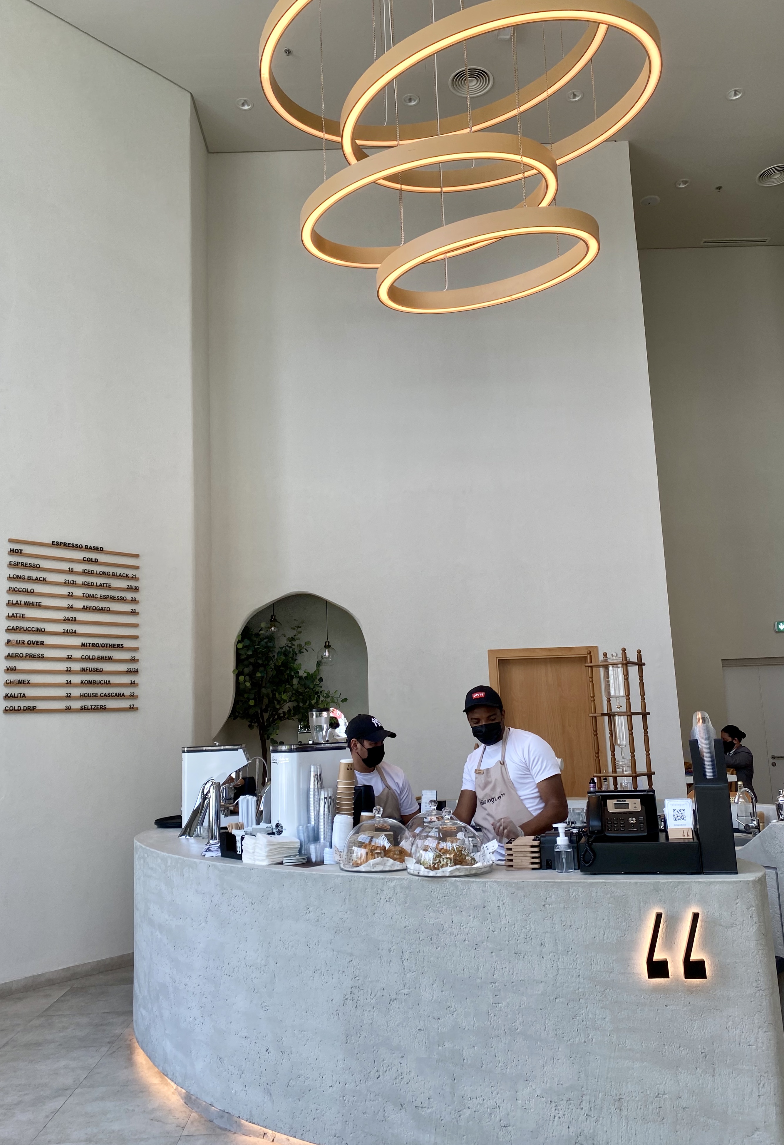 Unlike some others in the initial opening phase the staff here were knowledgeable and the coffee was worth the drive. Their beverage menu is extensive with black and milk based drinks at reasonable prices too unlike some nearby competitors. It’s a self pick-up affair that’s more akin to the coffee chain experience but once you’ve picked up your drink there’s loads of seating to ‘gather, socialize and study’. I can’t comment on the food because when I went there wasn’t any, not a single crumb, due to non-delivery of their order, disappointing but completely plausible. The cafe has a prominent location near the corniche and Sheikha Fatima Park with there’s lots of (paid) parking right outside which is always a bonus.
