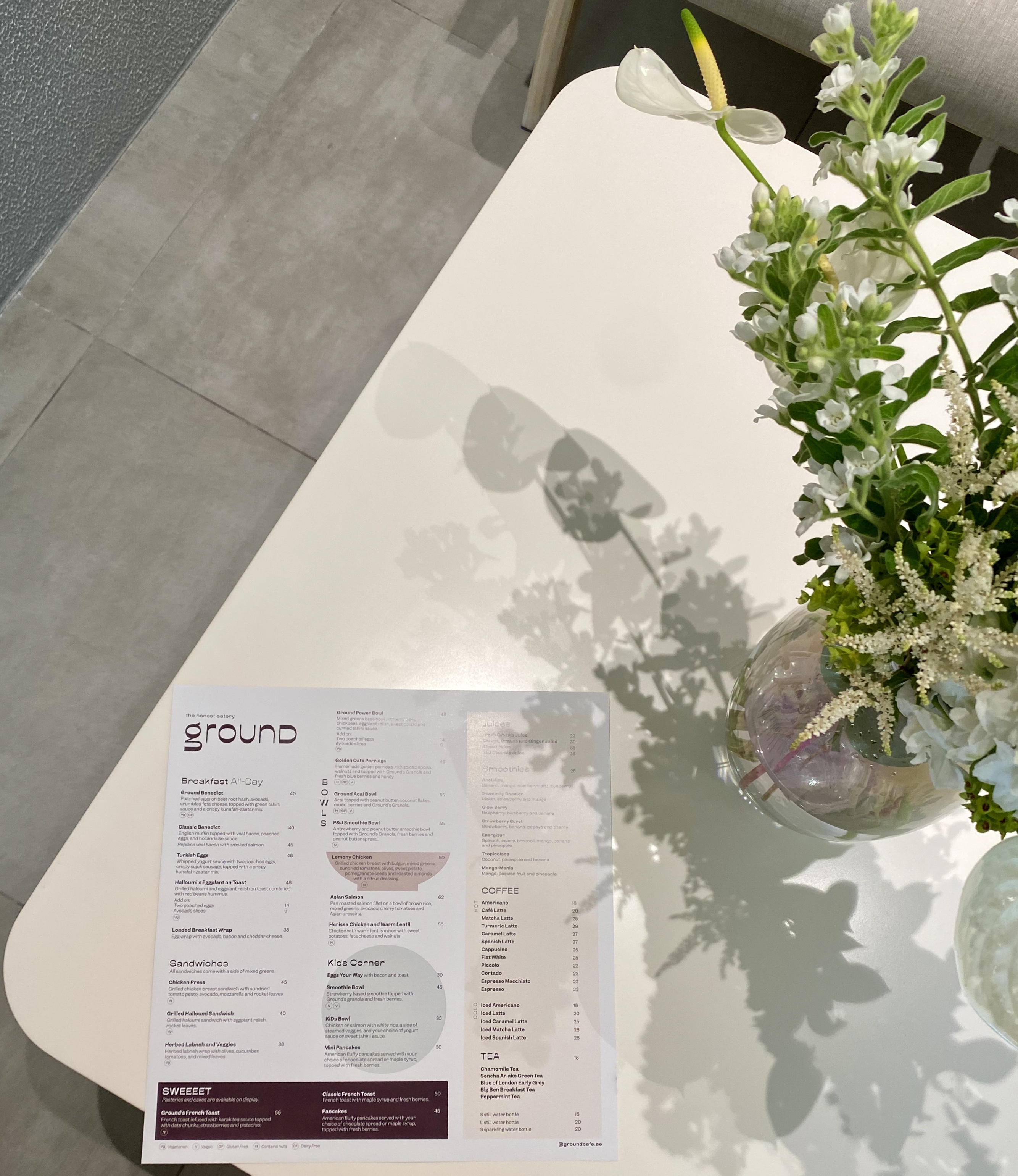 Ground, West Yas Plaza, Yas Island. Telephone : Opening Times : Daily 9am – 11pm Instagram: @groundcafe.ae