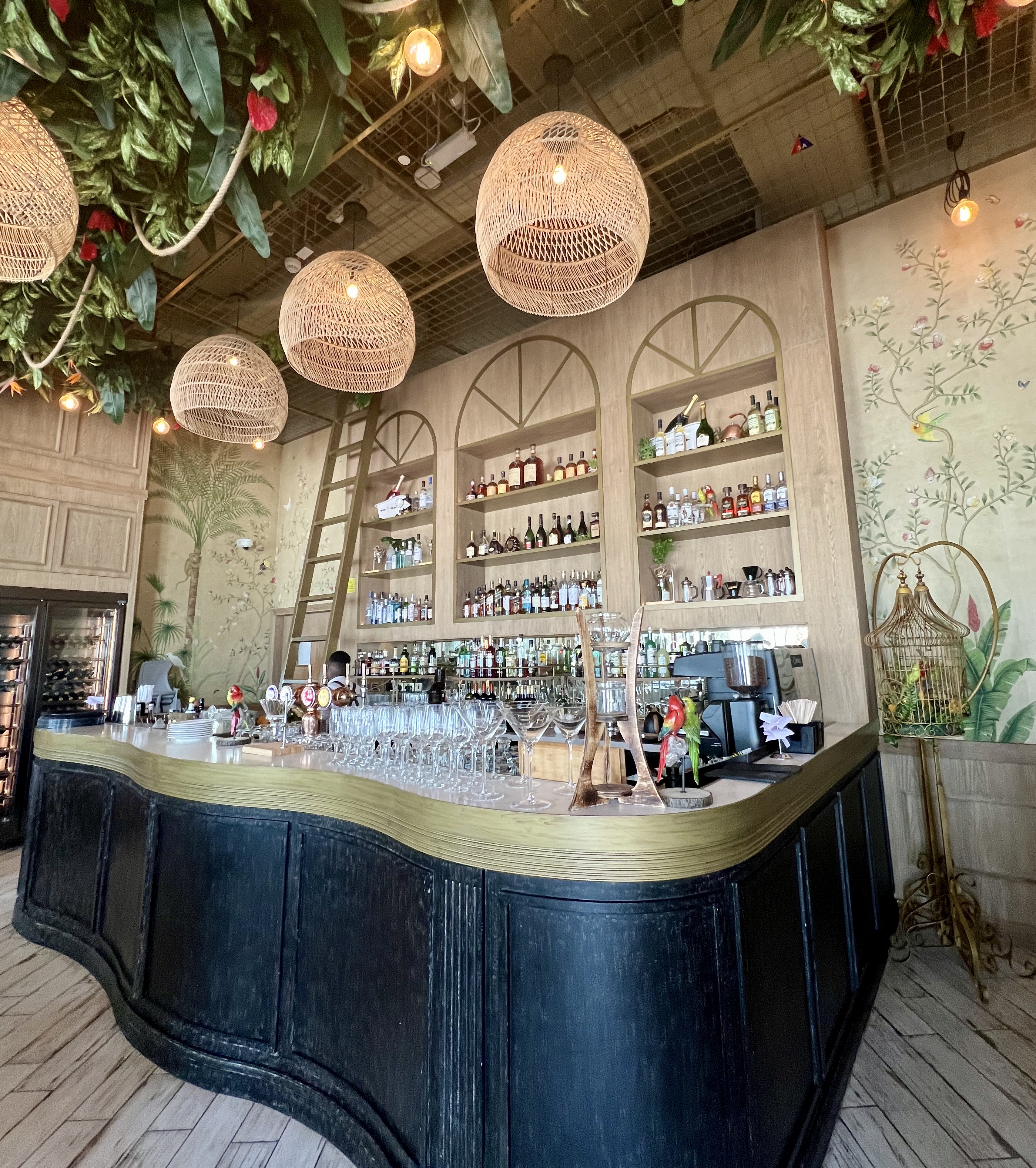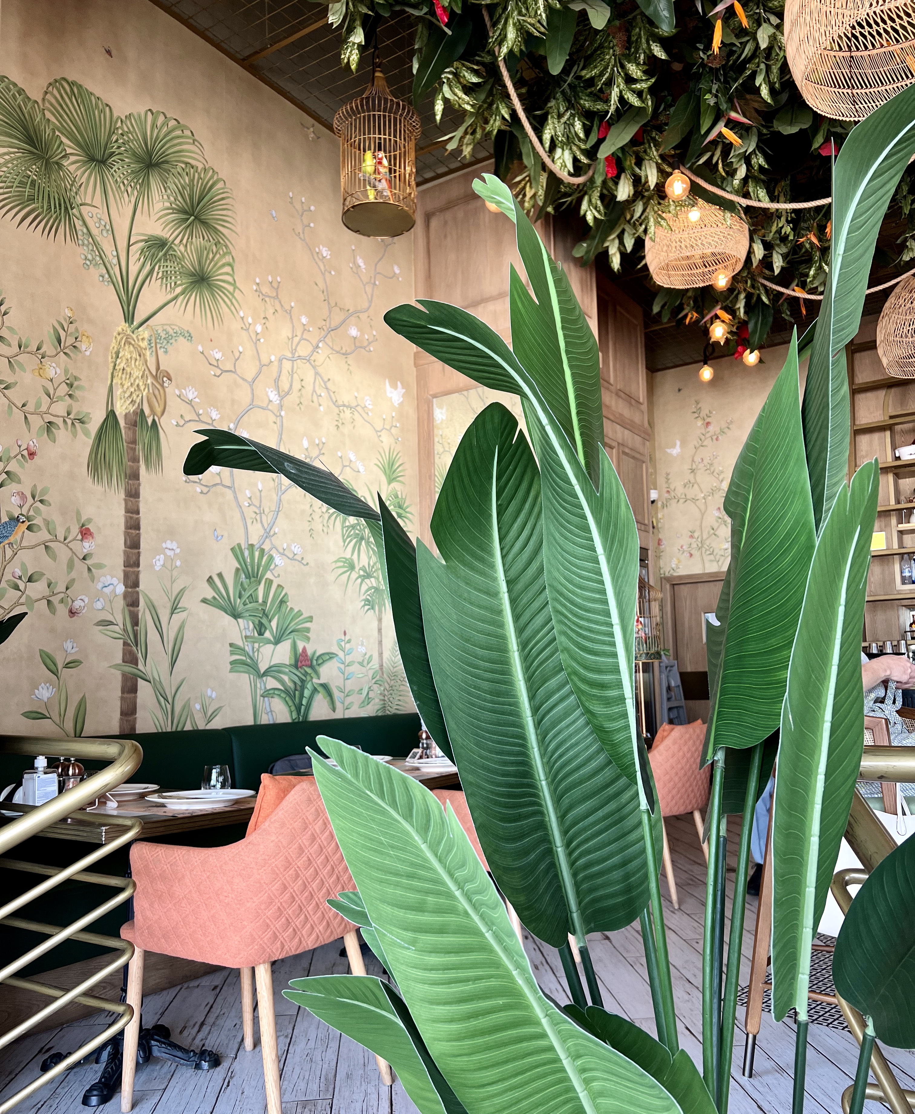 The colourful restaurant has an eclectic interior akin to a tropical forest with botanical wallpaper, faux greenery covering the ceiling and rattan light shades offset by the monochrome tiled floor. Various accessories like parrots in ornate golden cages and sporadic hanging monkeys complete the theme. Indoor seating areas are spread around the entrance with more tables located in front of the central bar in the raised section. The large outside terrace accommodates more tables offering ocean views.