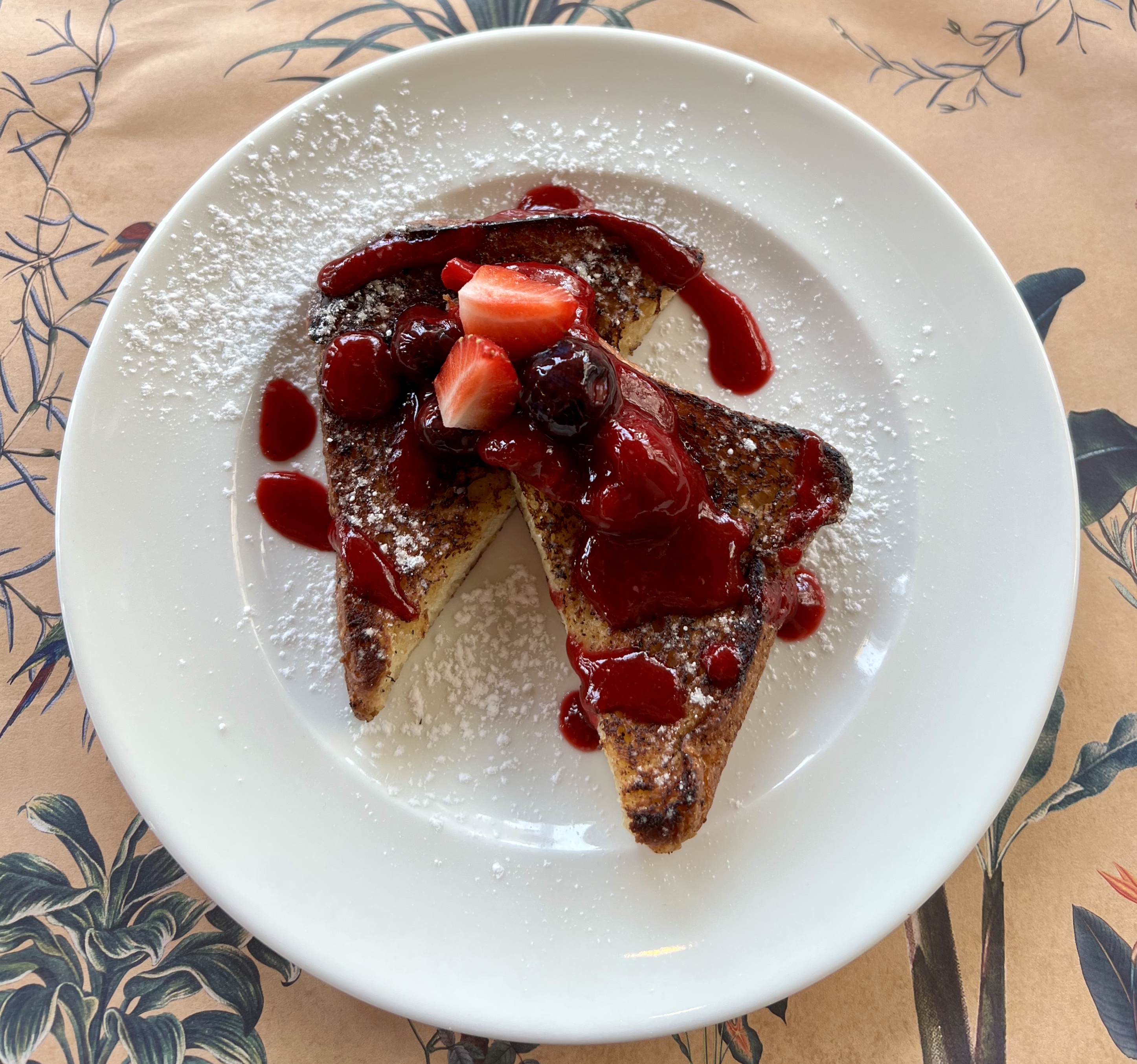 We opted for the chia seeds and banana split that’s served with yoghurt, granola and berries and a healthy green smoothie. Second course options were an omelette served with toast and a green salad or galette breton, a buckwheat thin pancake that’s folded and served with a filling of cheese, turkey ham and a fried egg. For the final course we had the tasty brioche French Toast with cinnamon butter mixed berries. All the dishes I tried were good and there was so much food for a very affordable price.