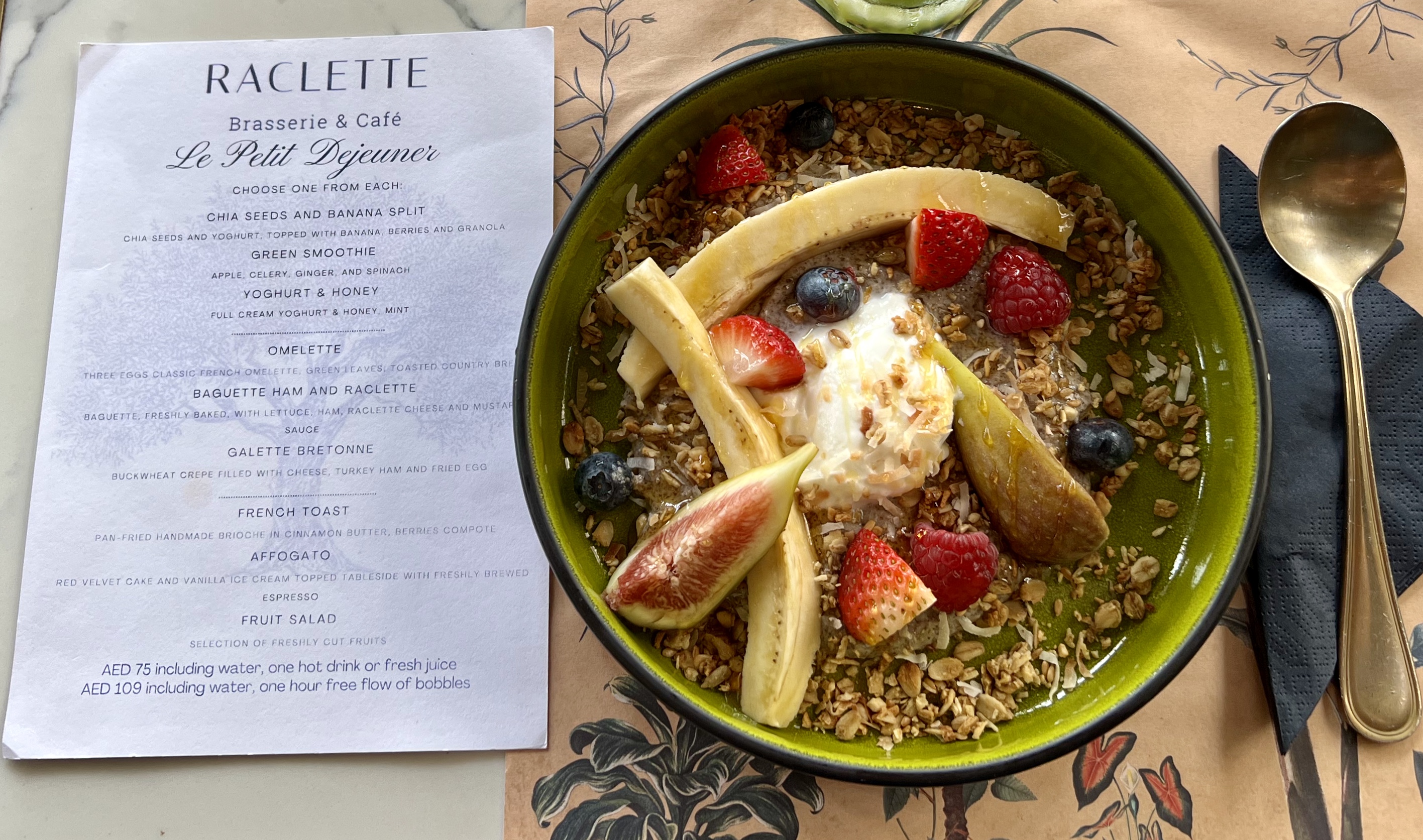 The à la carte menu has many choices and I personally recommend both the bruschetta flatbread and the tarte tatin served with vanilla ice cream and butterscotch sauce. Last week my friend and I tried the 3-course breakfast offer, Le Petit Dejeuner. First impressions were good with nine dishes to choose from over three courses plus water and a choice of tea, coffee or juice for an extremely reasonable AED 75 each. There’s also the option to add 1-hour of free-flowing bubbles for an additional AED 34.